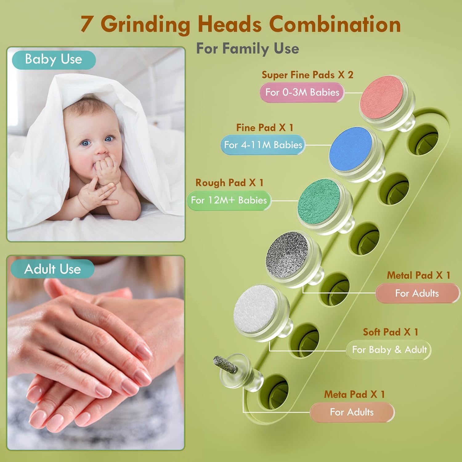 Yes! It includes multiple filing heads suitable for babies, kids, and adults — making it a versatile family nail care tool.